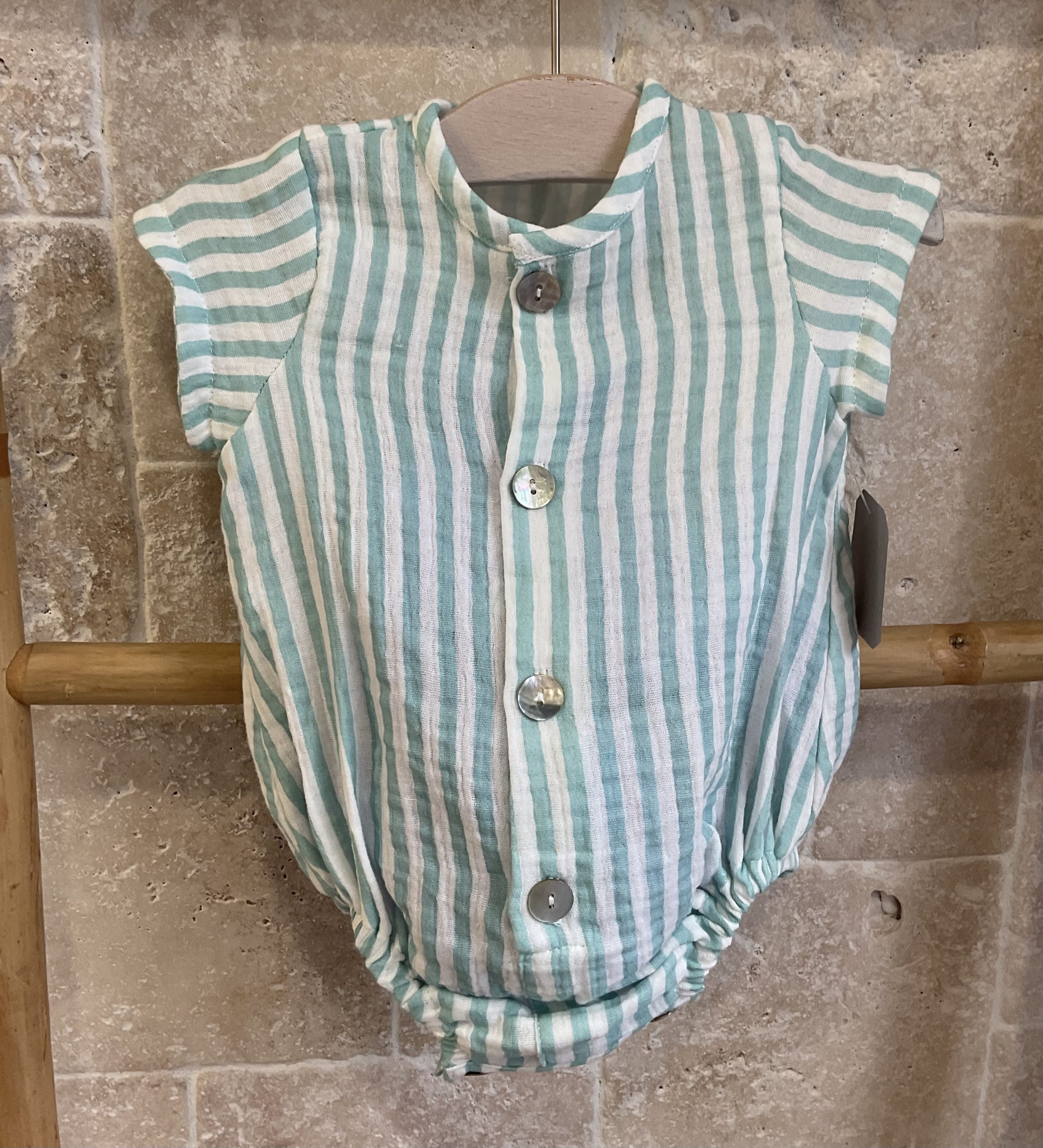 Mono corte pecho y tirantes en lazada. Bambula rayas verdes. 100% algodón.
